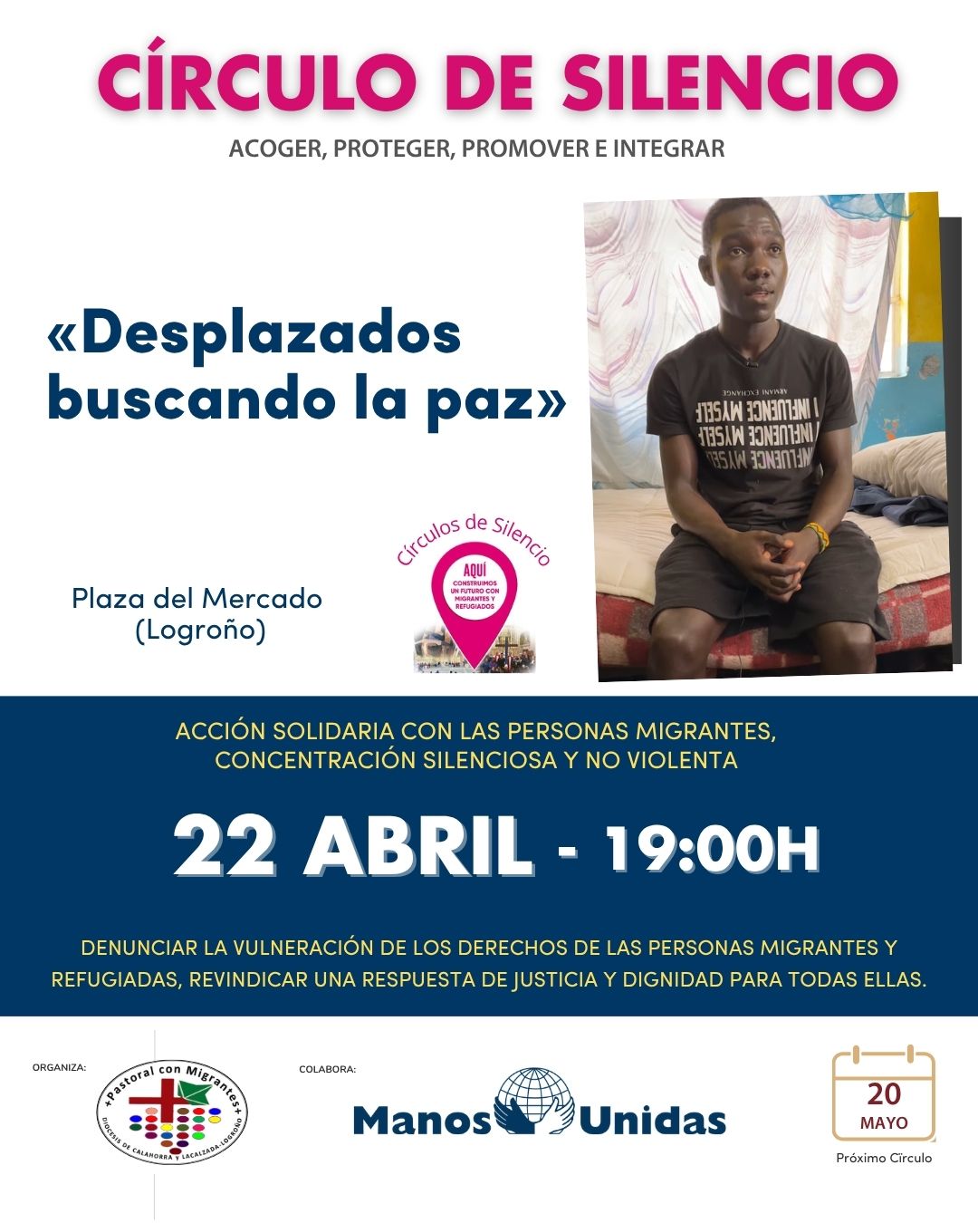 Manos Unidas invita a la ciudadanía a participar en una nueva edición del Círculo de Silencio, una acción no violenta de sensibilización social en solidaridad con las personas migrantes y refugiadas. Bajo el lema “Desplazados buscando la Paz”, el encuentro se celebrará el miércoles 22 de abril a las 19:00 horas en la Plaza del Mercado de Logroño.